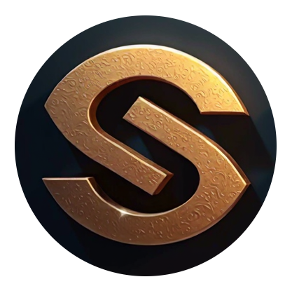 Stylized gold letter "S" with engraved patterns on a dark circular background.